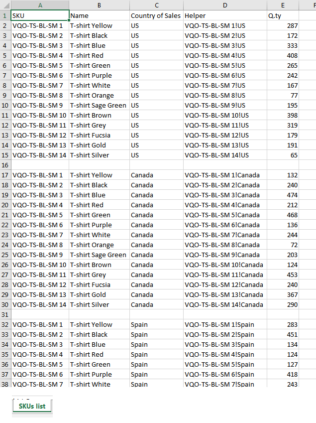As VLOOKUP can search a value in one column only, you need to create a helper column in the tab “SKUs list” that combines the SKU and the Country for each item (I have also added a “!” for clarity but this may not be necessary in real applications).