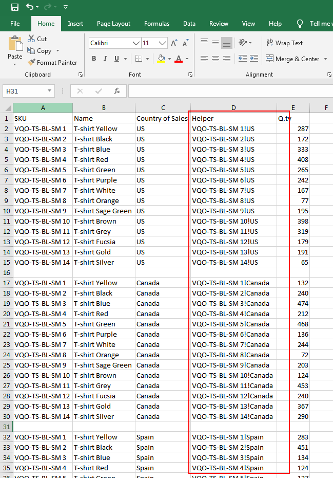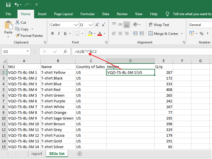 copy/paste the formula down in column “D” now. This will be the value identifying SKU and Country for each item.