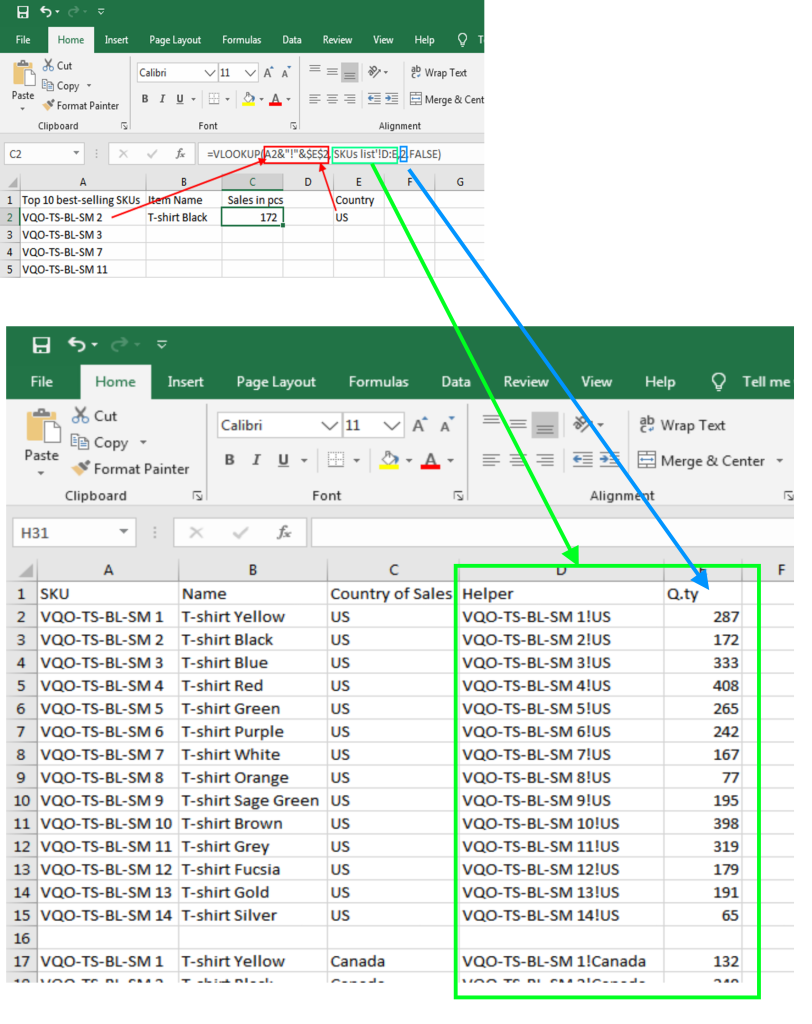 =VLOOKUP(A2&"!"&$E$2,'SKUs list'!D:E,2,FALSE)A2&"!"&$E$2combines the SKU and the country in cell E2, note the “$” to keep this cell reference fixed as the Country will not change when it comes to copying the formula down.'SKUs list'!D:Eselects the area whereA2&"!"&$E$2must be looked for.2, this is to instruct the formula to return the data in the second column ifA2&"!"&$E$2is found in'SKUs list'!D:E.Falseis to instruct the formula that we are interested only in perfect matches ofA2&"!"&$E$2.